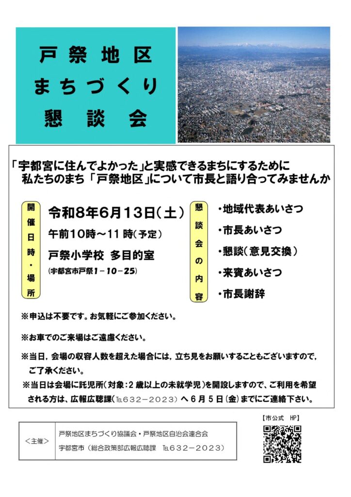 6月13日(土)、戸祭小学校 多目的室にて開催されます。「宇都宮市に住んでよかった」と感じられるまちづくりについて、市長と一緒に語り合ってみませんか?申込みは不要ですので、どなたでもお気軽にご参加ください。なお、当日は託児所もご利用いただけます。ご希望の方は、6月5日(金)までに広報広聴課(☎632-2023)へご連絡ください。