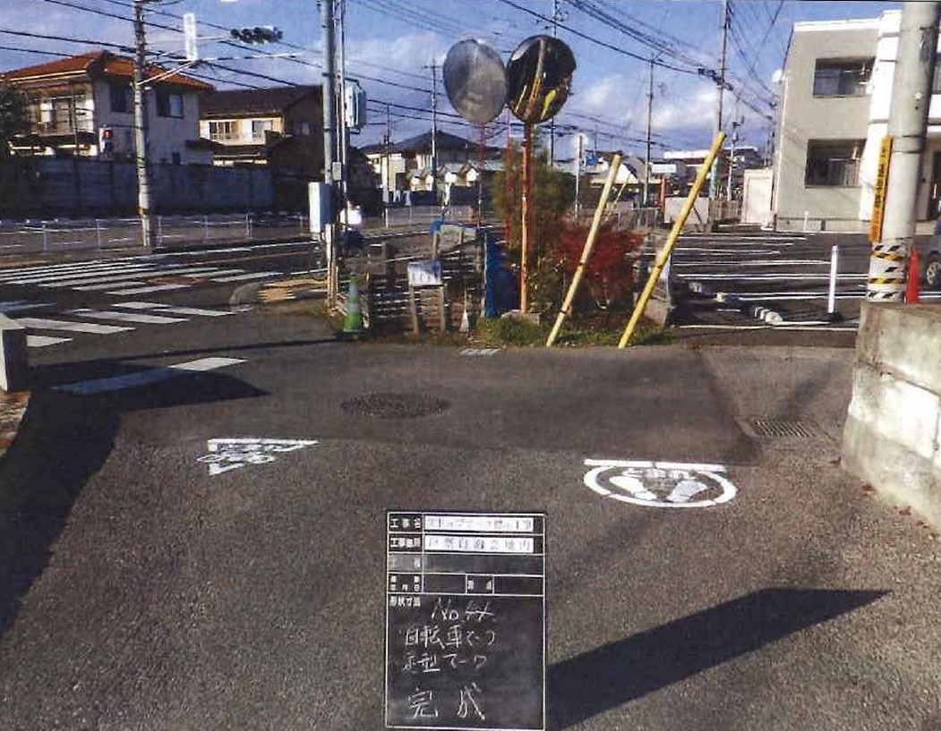 毎年、11月~12月に交通安全に願いを込めて、交通安全標示、ストップマーク(足型と自転車)の設置工事を行っています。